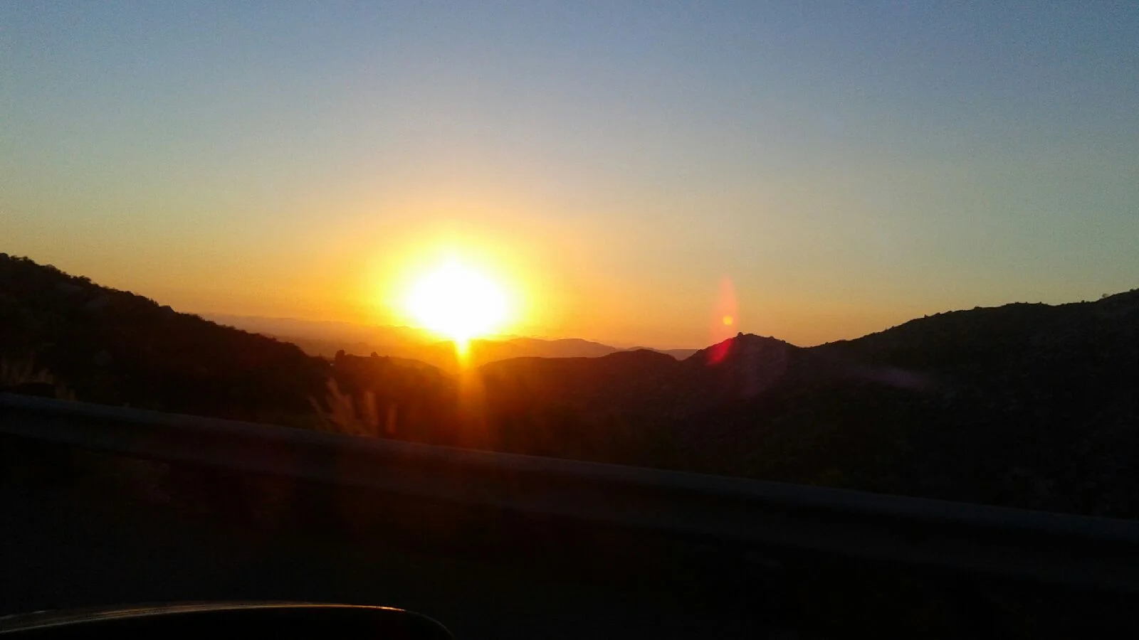 Sunset over mountainous landscape with a guardrail in the foreground.